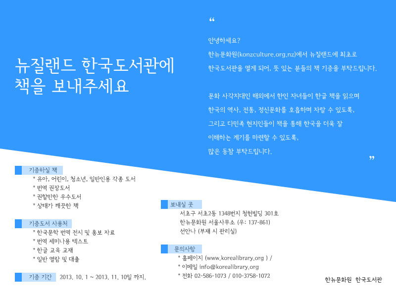 한뉴문화원(konzculture.org.nz)에서 뉴질랜드에 최초로 한국도서관을 열게 되어, 뜻 있는 분들의 책 기증을 기다립니다.