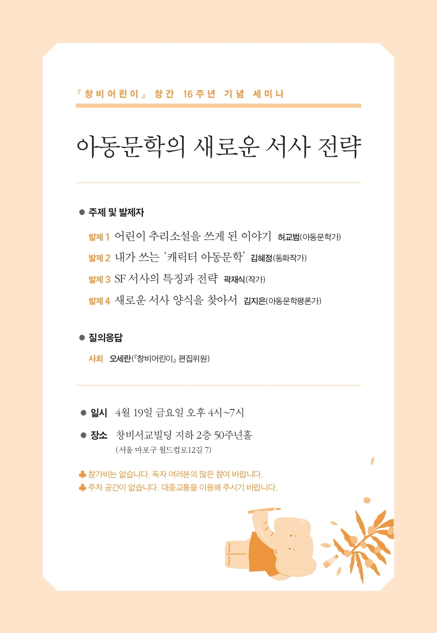 계간 『창비어린이』는 2003년 창간 이후 해마다 무료 공개 세미나 또는 심포지엄을 개최하여 우리 아동문학과 어린이책 마당의 주요 현안에 대해 이야기 나누는 자리를 마련해 왔습니다. 올해는 창간 16주년을 맞이하여 ‘아동문학의 새로운 서사 전략’을 주제로 세미나를 엽니다.