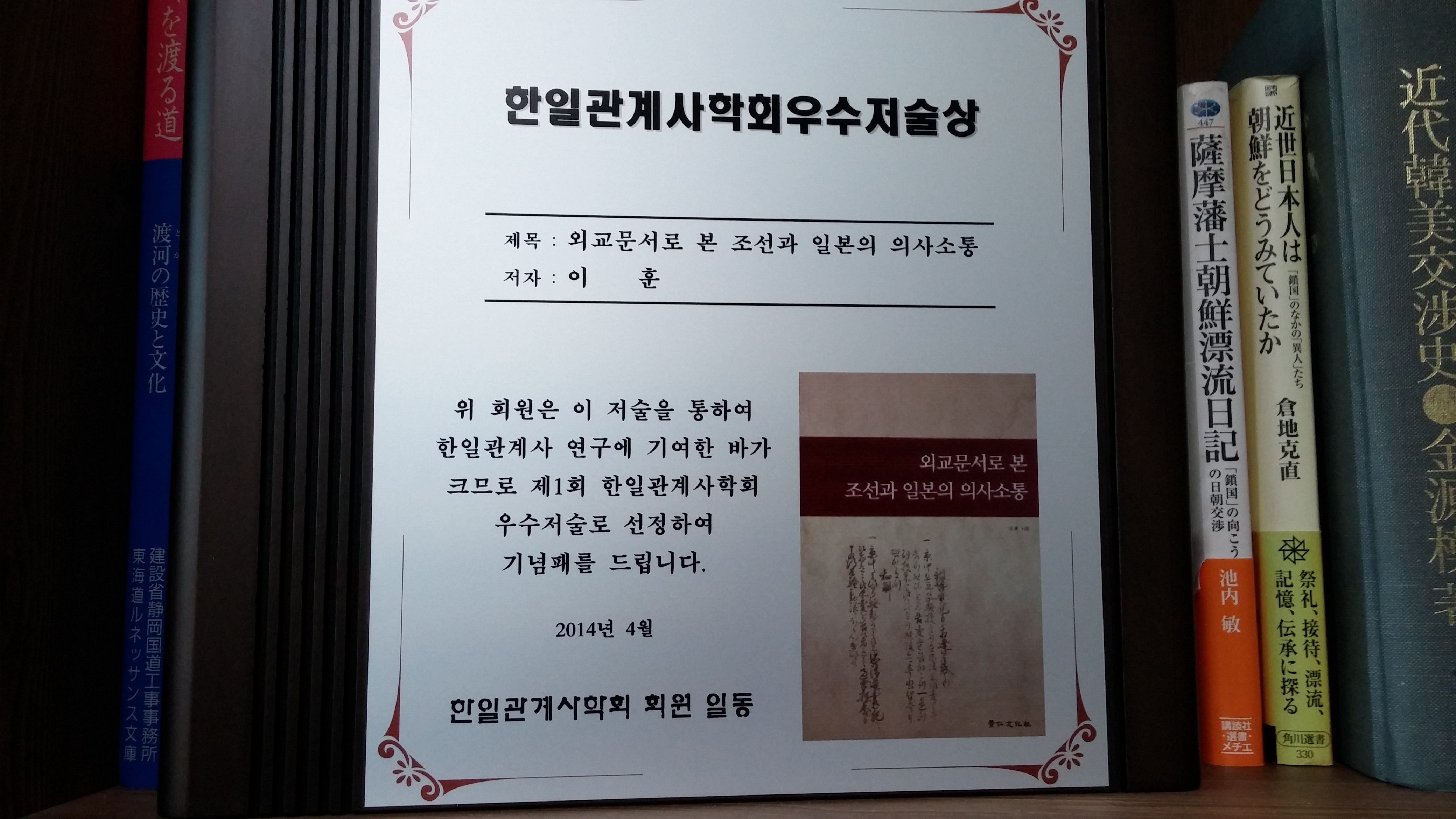 저술상은 이훈 선생님, 외교문서로 통해 본 조선과 일본의 의사소통(경인문화사, 2011)이었습니다.