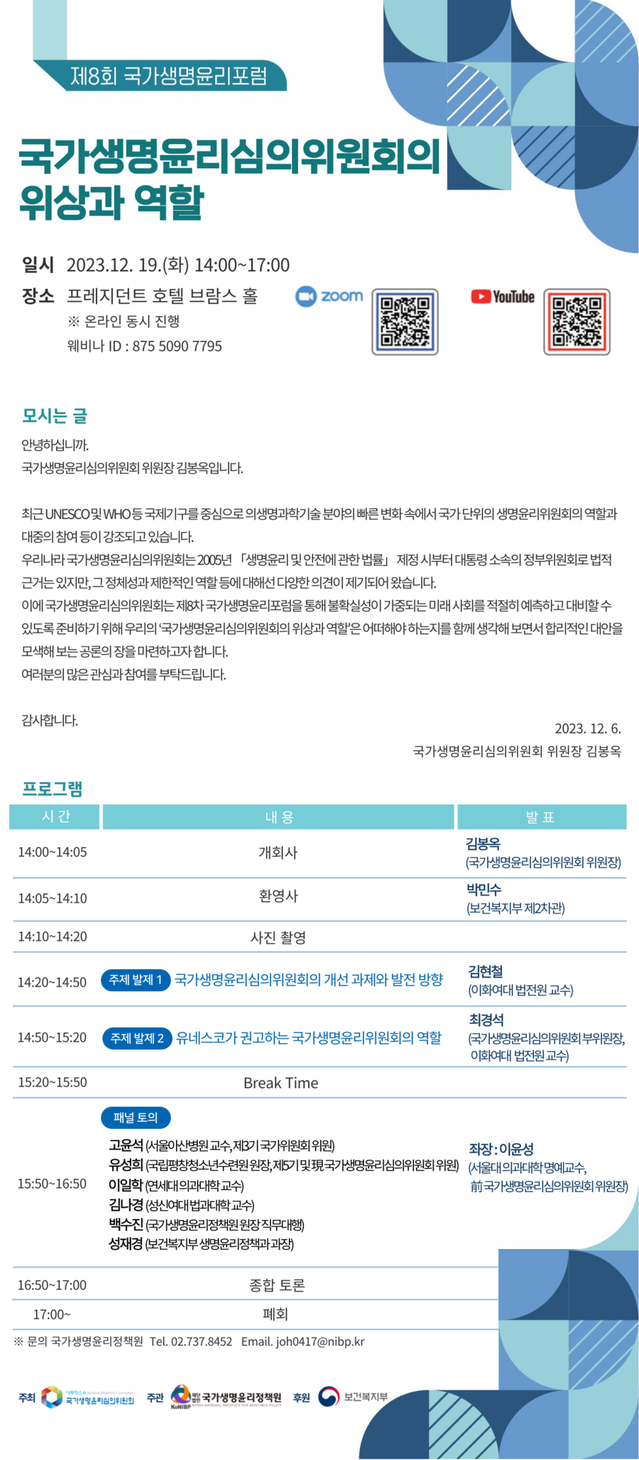 대통령 소속 국가생명윤리심의위원회 주최 ‘ 제8회 국가생명윤리포럼’를 안내드립니다.