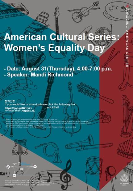 안녕하십니까? 주한미국대사관 아메리칸센터는Women’s Equality Day (여성 평등의 날)을 기념하는 강연 행사에 여러분을 초대합니다.