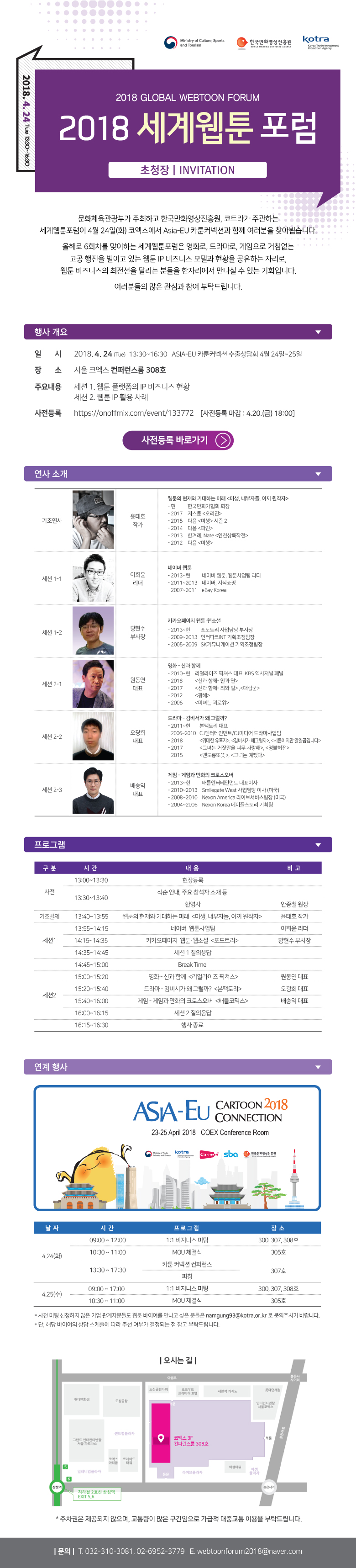 다름이 아니옵고, 4월 24일(화) 코엑스 컨퍼런스룸에서 2018년 세계웹툰포럼을 개최하여 관련 내용 보내드립니다.