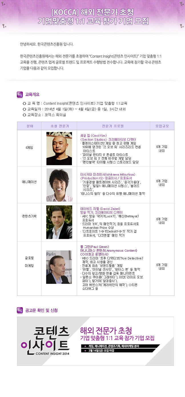 한국콘텐츠진흥원에서 주최하는 '콘텐츠 인사이트 : 기업맞춤형 1:1 교육' 안내입니다.