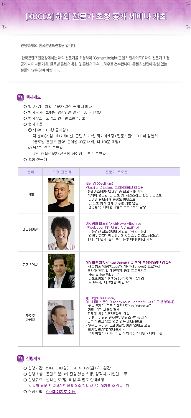 한국콘텐츠진흥원에서 주최하는 '콘텐츠 인사이트 : 해외 전문가 초청 공개 세미나 ' 안내입니다.