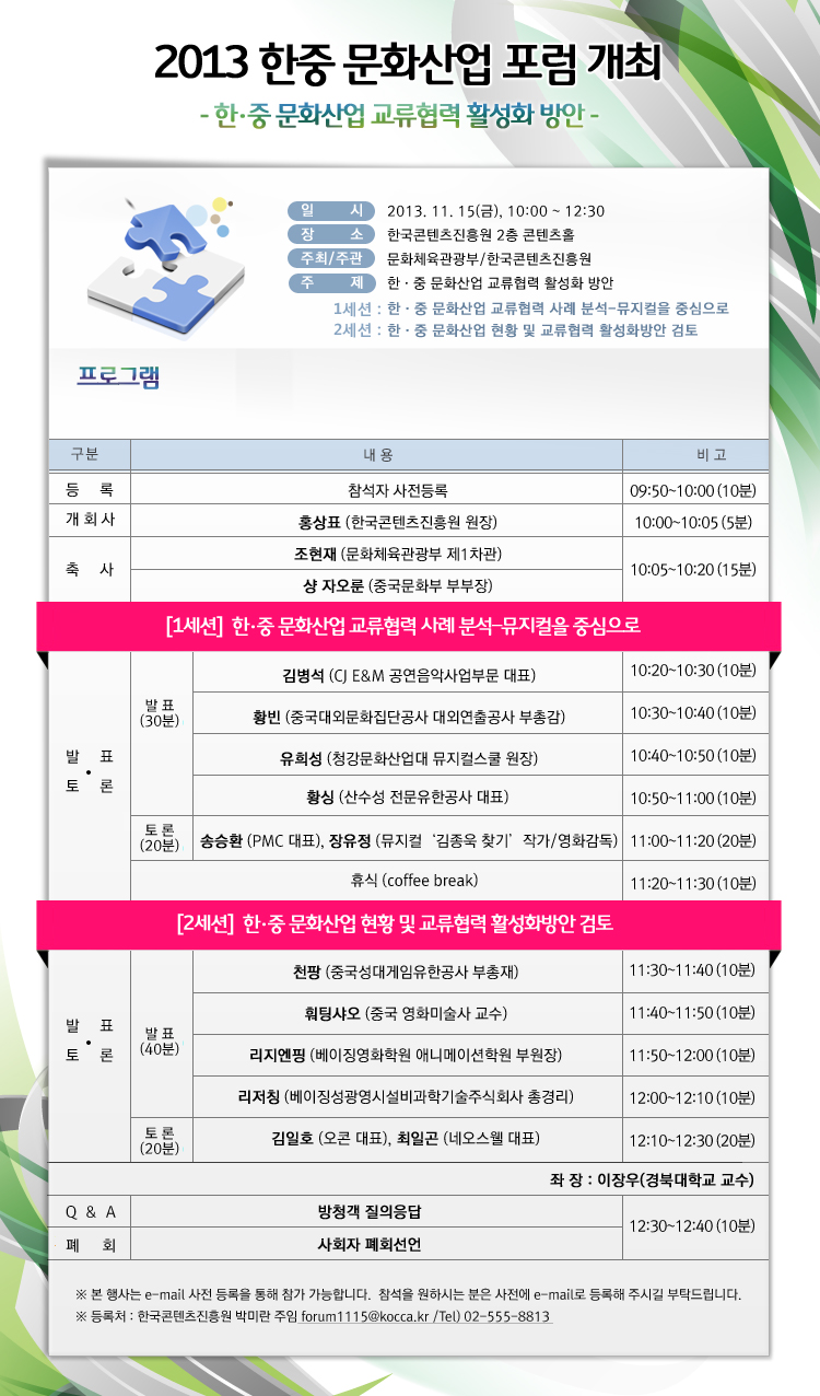2. 문화체육관광부에서 주최하고 한국콘텐츠진흥원에서 주관하는 [2013 한중문화산업포럼]이 오는 11.15(금) 한국콘텐츠진흥원 2층 콘텐츠홀에서 개최됩니다.
