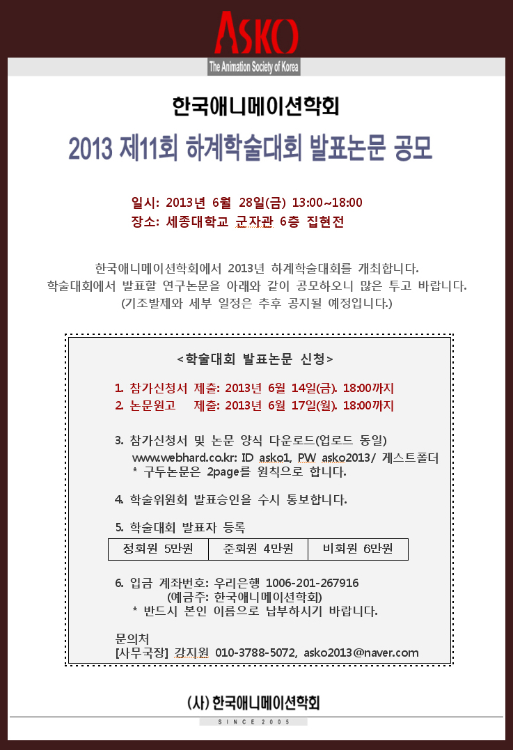 한국애니메이션학회에서 2013년 춘계학술대회를 개최합니다.