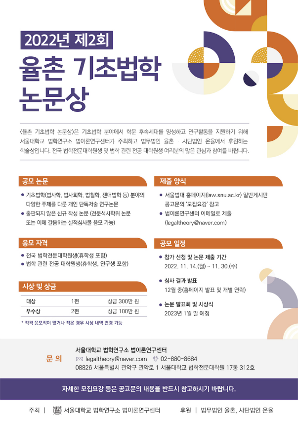 <율촌 기초법학 논문상>은 기초법학 분야에서 학문 후속세대를 양성하고 연구 활동을 지원하기 위해 서울대학교 법학연구소 법이론연구센터가 주최하고 법무법인 율촌·사단법인 온율에서 후원하는 학술상입니다. 전국 법학전문대학원생 및 법학 관련 전공 대학원생 여러분의 많은 관심과 참여를 바랍니다.