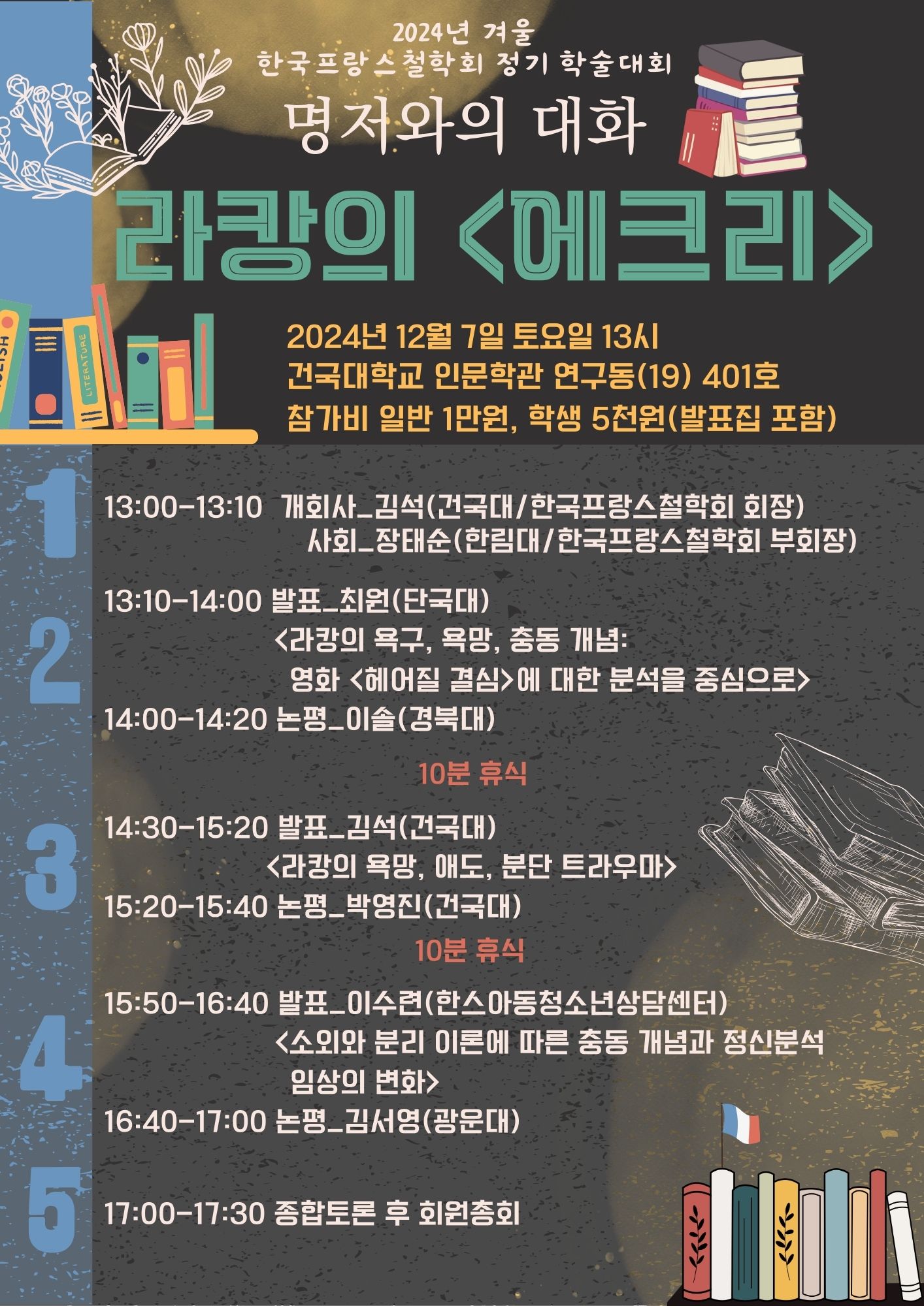 명저와의 대화는 프랑스철학회가 꾸준히 진행하는 학술 전통입니다. 현대 사상에 큰 발자취를 남긴 철학자들의 주저를 선택해, 사상의 핵심을 비판적으로 읽어내면서 문제의식을 오늘날 상황에 접목시키는 진지한 대화의 장으로 성과를 쌓아가고 있습니다. 라캉은 정신분석가이지만 구조주의와 포스트구조주의 논쟁사에 흐름에 큰 영향을 미치면서 주체의 철학을 새롭게 조명한 문제적 인물이기도 합니다.