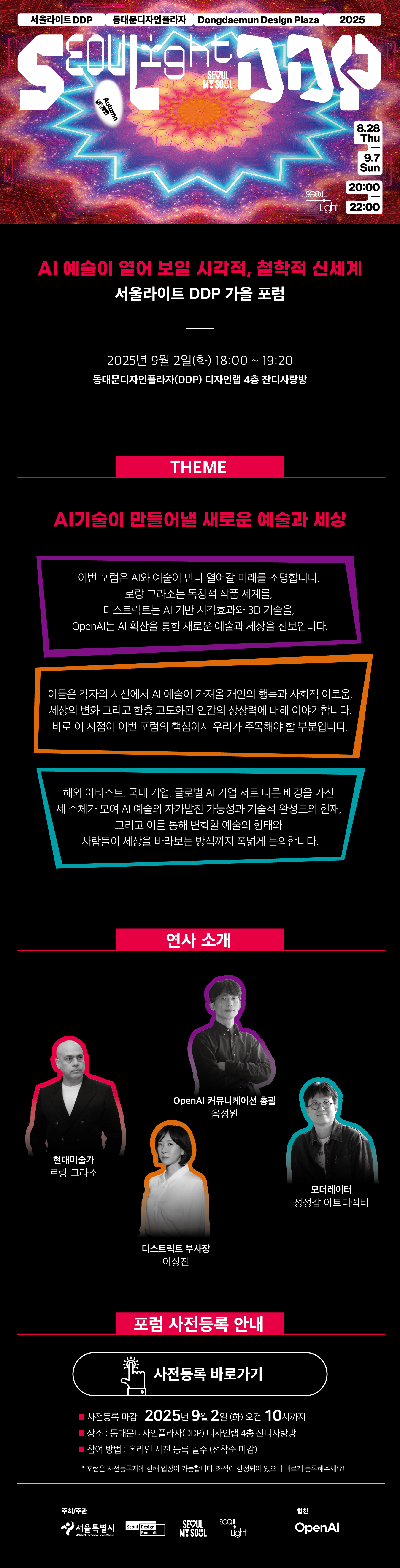 또한, 행사 기간중인 9/2(화) 18시부터 '서울라이트 DDP 2025 가을 포럼'이 진행됩니다.