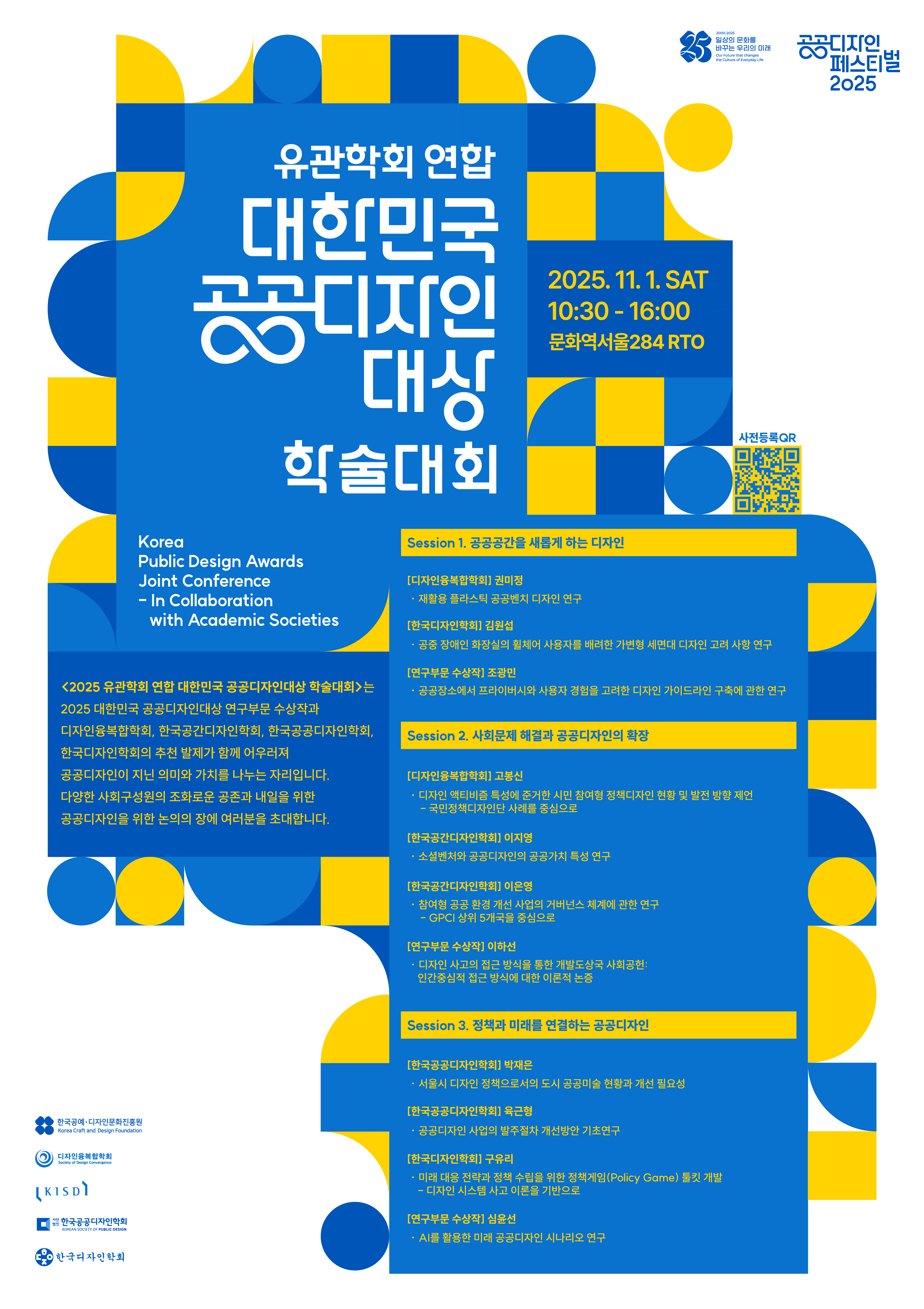 2025 유관학회 연합 대한민국 공공디자인대상 학술대회는 2025 대한민국 공공디자인대상 연구부문 수상작과 디자인융복합학회,한국공간디자인학회, 한국공공디자인학회, 한국디자인학회의 추천 발제가 함께 어우러져 공공디자인이 지닌 의미와 가치를 나누는 자리입니다.