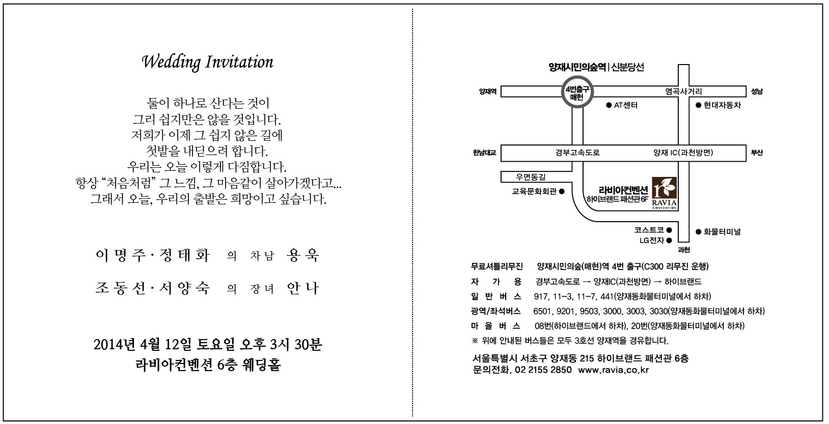 한국품질경영학회에서 알려드립니다. 서울대 통계연구소 이명주 책임연구원 차남 이용욱氏 결혼식이 2014년 4월 12일(토) 오후 3시 30분 라비아컨벤션 6층 웨딩홀에서 열릴 예정입니다. 자세한 사항은 첨부파일을 참고하시기 바랍니다. -------------------- 아 래 -------------------------- 일시: 2014년 4월 12일(토) 오후 3시 30분 장소: 라비아컨벤션 6층 웨딩홀 (서울시 서초구 양재동 215 하이브랜드 패션관 6층, 02-2155-2850)