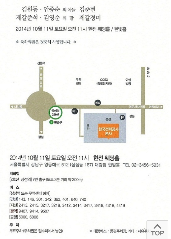 한국품질경영학회에서 알려드립니다. 오랫동안 본 학회에 도움을 주신 한국수력원자력 김원동 본부장님(한빛원자력본부장) 자녀 김준현氏 결혼식이 2014년 10월 11일(토) 오전 11시 한전 웨딩홀/한빛홀에서 열릴 예정입니다. 자세한 사항은 아래 내용과 첨부파일을 참고해주시기 바랍니다. -------------------- 아 래 -------------------------- 일시: 2014년 10월 11일(토) 오전 11시 장소: 한전 웨딩홀 / 한빛홀 (서울시 강남구 영동대로 512 대강당 한빛홀, 02-3456-5931) 교통편: 지하철 2호선 삼성역 7번 출구 도보 3분 * 축하화환은 정중히 사양합니다. *