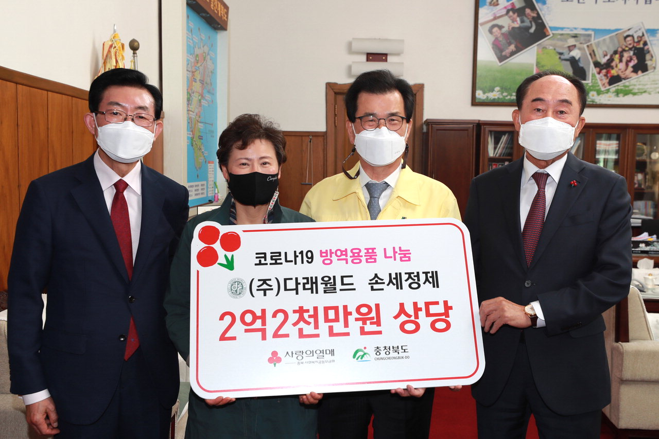[ 중부매일 안성수 기자] 김해윤 ㈜다래월드 회장은 26일 충북도청을 방문해 코로나19로 어려움을 겪고 있는 도민들을 위해 써달라며 2억2천만원 상당의 손세정제 1만개를 전달했다.