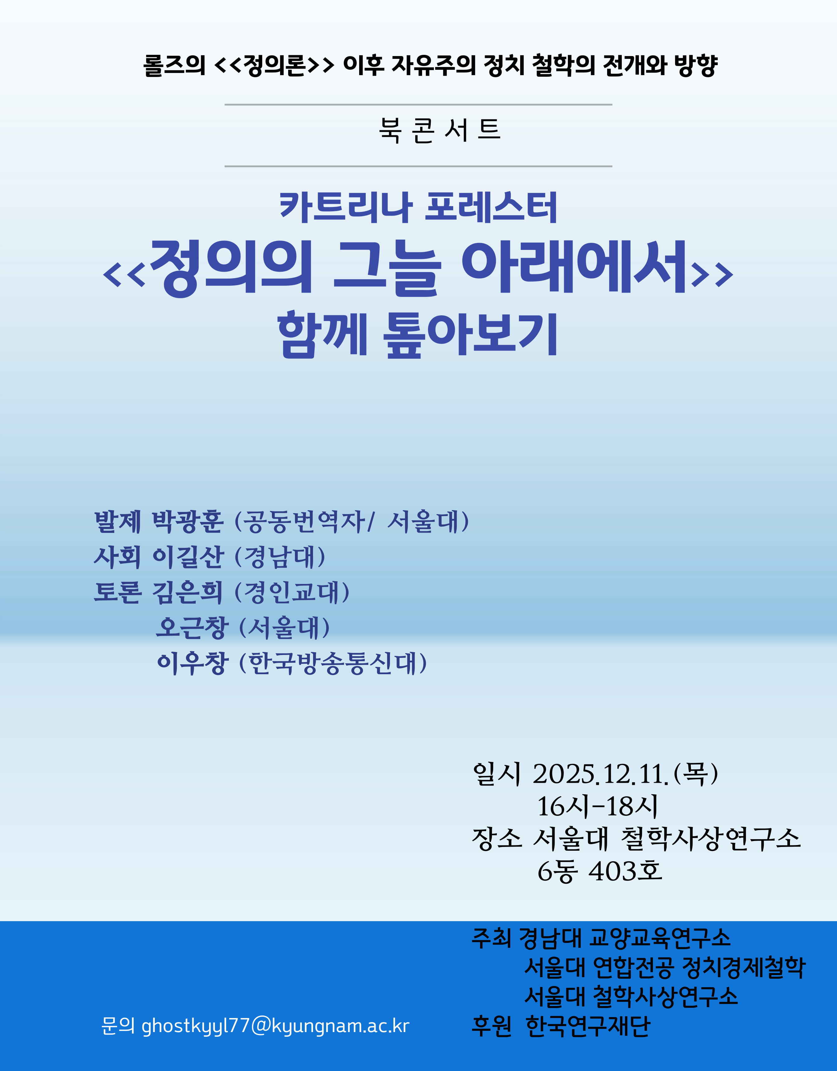 서울대학교 철학사상연구소와 경남대학교 교양교육연구소, 그리고 연합전공 정치경제철학이 공동으로 마련한 이번 세미나에서는 공역자 가운데 한 사람인 박광훈 선생님의 발제를 시작으로 김은희(경인교대)), 오근창(서울대), 이우창(방송통신대 ) 선생님이 각자의 문제의식에서 포레스터의 논의를 비판적으로 검토합니다. 이어 1시간 동안 종합 토론을 진행하며 롤즈의 ‘그늘’에서 사유되는 오늘의 정치철학과 지성사 연구의 방향을 함께 모색하고자 합니다. 본 행사는 참가자 전원이 『정의의 그늘 아래에서』를 숙지하였다는 전제하에 진행됩니다.