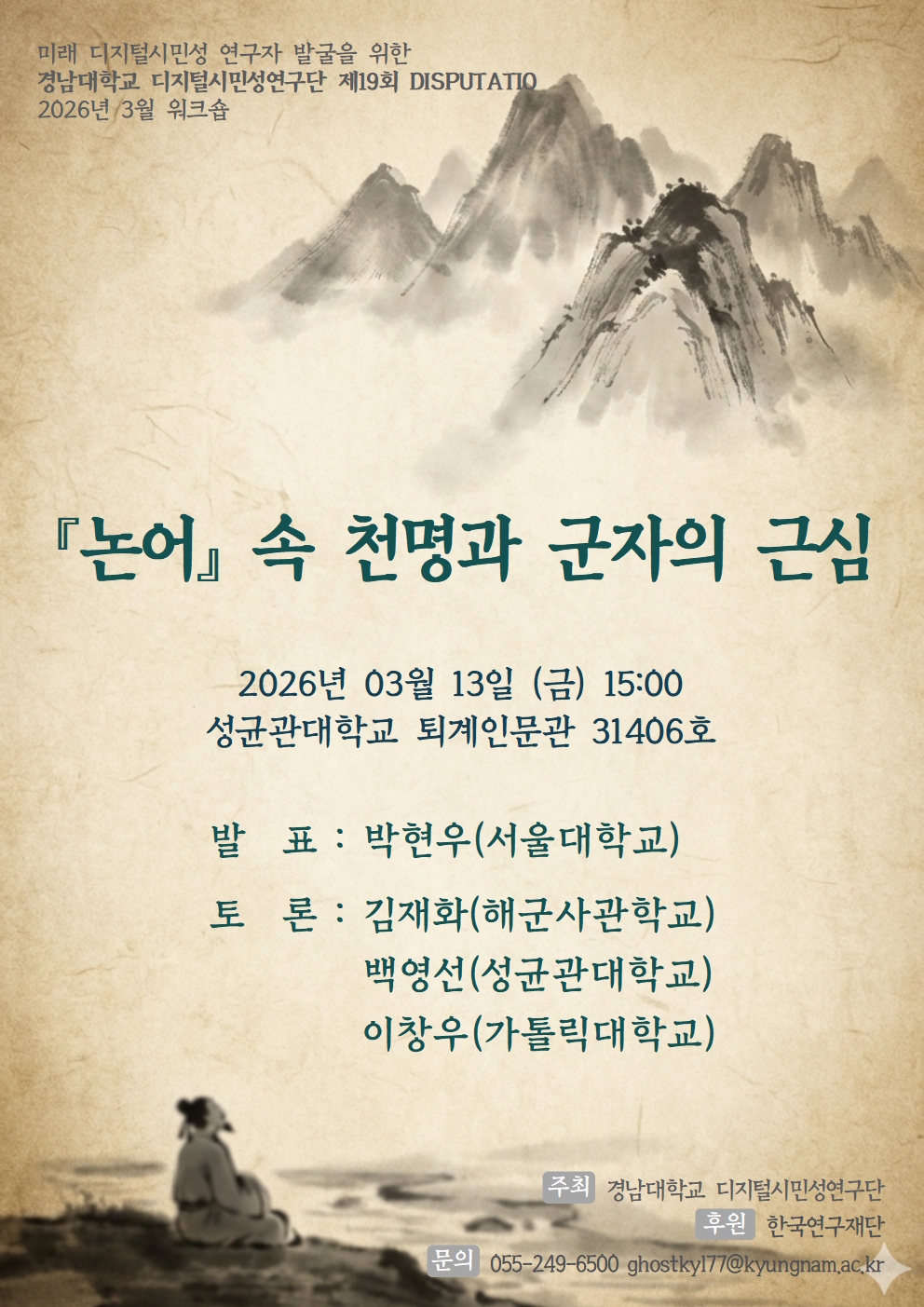 본 연구소는 <디지털시민성 함양을 위한 지역형 인문교양교육 모형 개발 및 확산>이라는 주제로 2021년부터 한국연구재단의 『인문사회연구소지원사업』을 수행하고 있습니다. 해당 연구사업의 여러 목표 중 하나는 “미래의 디지털시민성 담론을 주도할 신진연구자 발굴”입니다. Disputatio는 이러한 목표를 확립하고 확산하는 연구사업의 일환으로 진행하고 있습니다. 2026년의 봄을 알리듯 19회차 디스푸타치오의 문을 열었습니다.