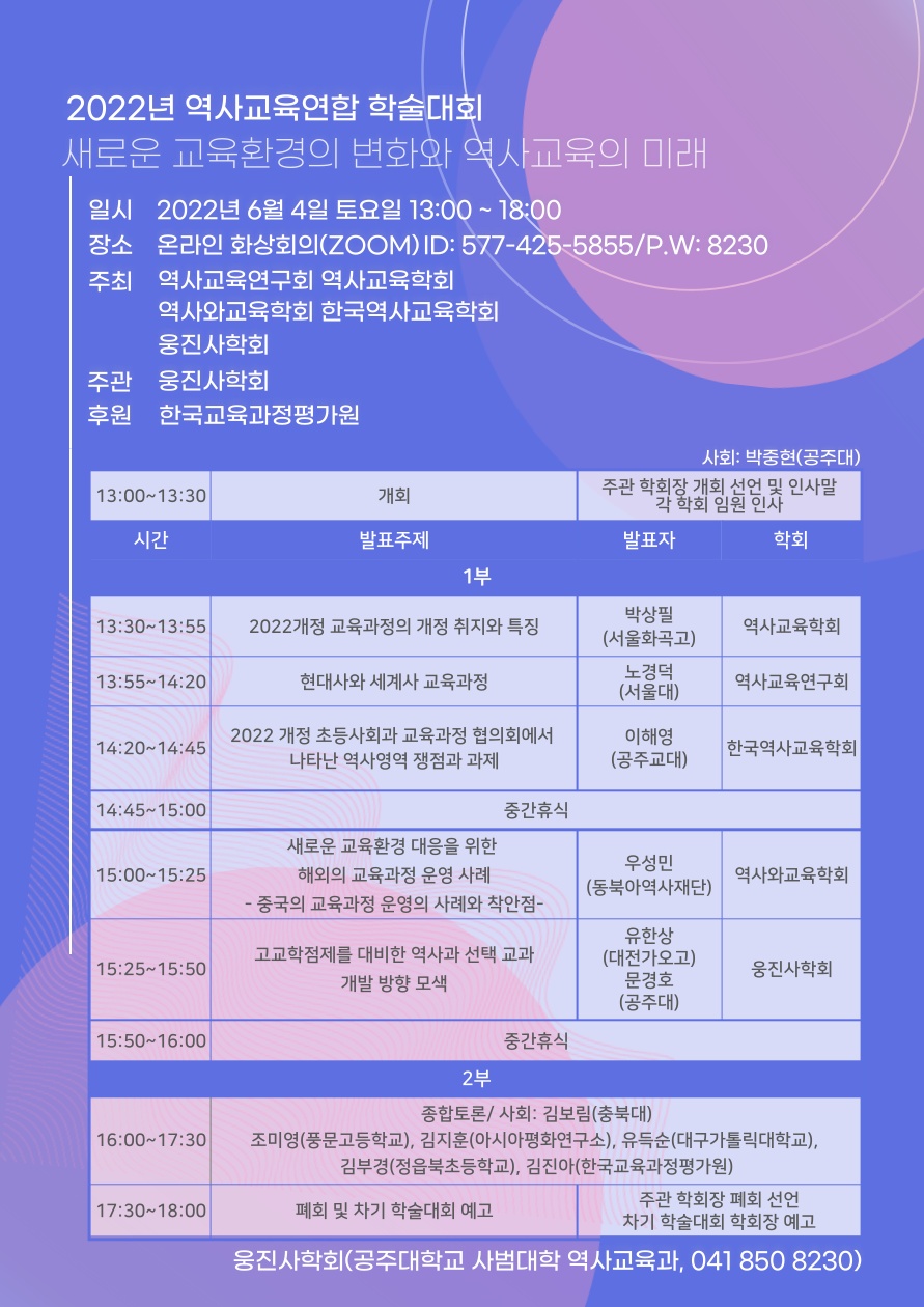 웅진사학회에서 주관하는 2022년 역사교육 연합학술대회를 안내드립니다.