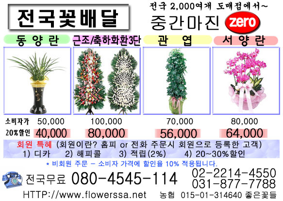 ▶ 축하/근조화환 3단 *7만7천원* ◀ 저희 “꼬시조아”는 기업체 전문 꽃배달로써 전국 어디든지 주문후 3시간이내에 배달됩니다. [가격비교] 축하화환 3단 / 근조화환 3단 소비자가격 100,000원 할인가 77,000원 * 무조건 20%이상 * ------------------------------ 홈페이지 주소 : http://www.flowerssa.net TEL : 080-4545-114 (전국무료전화) * 인터넷 검색창에 “꼬시조아”를 검색하세요 ------------------------------ 취급품목: 꽃다발,꽃구니,동양난,서양난 관엽,경조화환,분재,각종화분 등 [비번 4601]