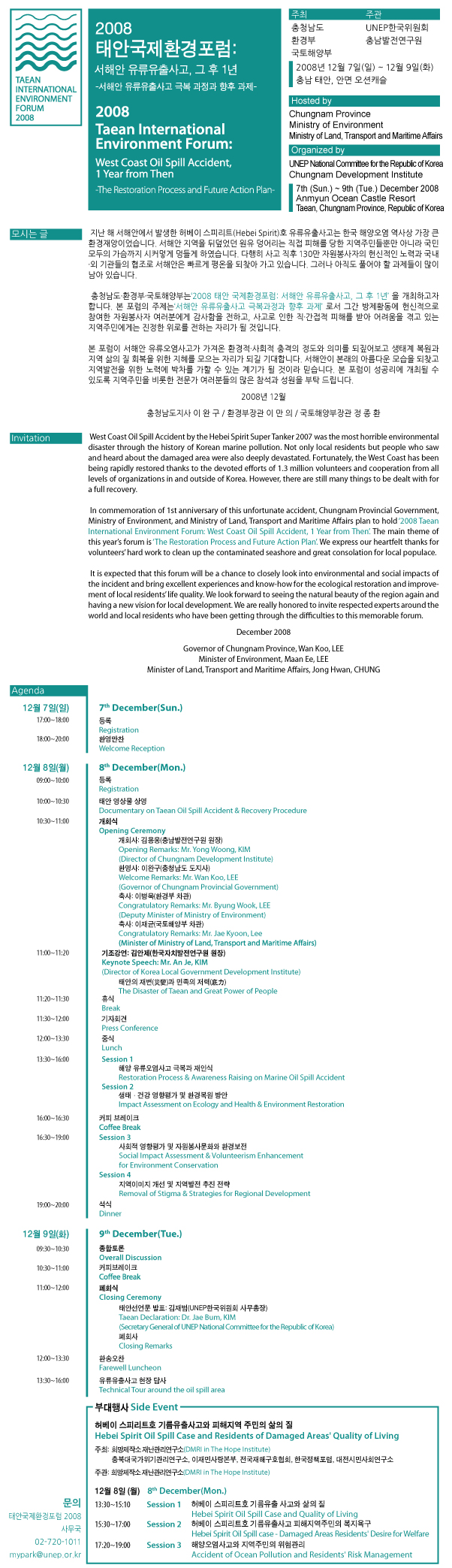 포럼 웹사이트: www.unep.or.kr/taeanforum 문의: 포럼사무국-UNEP한국위원회 커뮤니케이션팀 2008 태안국제환경포럼 담당자 02-720-1011 , mypark@unep.or.kr