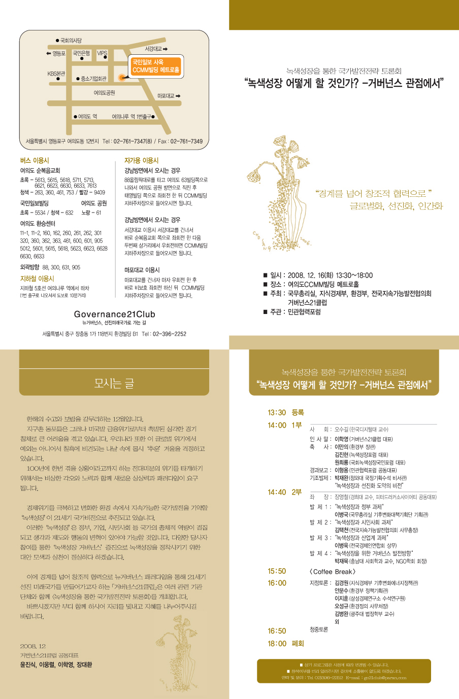 경계를 넘어 창조적 협력으로 글로벌화, 선진화, 미래화 녹색성장을 통한 국가발전전략 토론회 “녹색성장 어떻게 할 것인가? -거버넌스 관점에서-” 일시 : 2008. 12. 16(화) 13:30~18:00 장소 : 여의도CCMM빌딩 메트로홀 주최 : 국무총리실, 지식경제부, 환경부, 전국지속가능발전협의회 거버넌스21클럽 주관 : 민관협력포럼 모시는 글 한해의 수고와 보람을 갈무리하는 12월입니다. 지구촌 동포들은 그러나 미국발 금융위기로부터 촉발된 심각한 경기침체로 큰 어려움을 겪고 있습니다. 우리나라 또한 이 글로벌 위기에서 예외는 아니어서 칠흑에 비견되는 나날 속에 몹시 ‘추운’ 겨울을 걱정하고 있습니다. 100년에 한번 겪을 상황이라고까지 하는 전대미문의 위기를 타개하기 위해서는 비상한 각오와 노력과 함께 새로운 상상력과 패러다임이 요구됩니다. 경제위기를 극복하고 변화한 환경 속에서 지속가능한 국가발전을 기약할 ‘녹색성장’이 21세기 국가비전으로 추진되고 있습니다. 이러한 ‘녹색성장’은 정부, 기업, 시민사회 등 국가의 총체적 역량이 결집되고 생각과 제도와 행동의 변혁이 있어야 가능할 것입니다. 다양한 당사자 참여를 통한 ‘녹색성장 거버넌스’ 증진으로 녹색성장을 정착시키기 위한 대안 모색과 실천이 절실하다 하겠습니다. 이에 경계를 넘어 창조적 협력으로 뉴거버넌스 패러다임을 통해 선진미래국가를 만들어가고자 하는 거버넌스21클럽은 여러 관련 기관단체와 함께 <녹색성장을 통한 국가발전전략 토론회>를 개최합니다. 바쁘시겠지만 부디 함께 하시어 자리를 빛내고 지혜를 나누어주시길 바랍니다. 2008.12 거번넌스21클럽 공동대표 윤진식, 이웅렬, 이학영, 장대환 <순서> 13:30 등록 14:00 1부 사 회: 오수길 (한국디지털대 교수) 인 사 말: 이학영 (거버넌스21클럽 대표) 축 사: 이만의 (환경부장관) 김진현 (녹색성장포럼 대표) 원희룡 (국회녹색성장국민포럼 대표) 경과보고: 이형용 (민관협력포럼 공동대표) 기조발제: 박재완 (청와대 국정기획수석) “녹색성장과 선진화 도약의 비전” 14:40 2부 좌장 장영철(경희대 교수, 피터드러커소사이어티 공동대표) 발제1: 녹색성장과 정부 과제 이병국 (국무총리실 기후변화대책기획단 기획관) 발제2: 녹색성장과 시민사회 과제 김택천 (전국지속가능발전협의회 사무총장) 발제3: 녹색성장과 산업계 과제 이병욱 (전국경제인연합회 상무) 발제4: 녹색성장을 위한 거버넌스 발전방향 박재묵 (충남대 사회학과 교수) 15:50 < Coffee Breake > 16:00 지정토론 김경원 (지식경제부 기후변화에너지정책관) 안문수 (환경부 정책기획관) 이지훈 (삼성경제연 수석연구원) 오성규 (환경정의 사무처장) 김병완 (광주대 법정학부 교수, NGO학회 회장) 외 16:50 청중토론 18:00 폐회 * 상기 프로그램은 사정에 따라 변경될 수 있습니다. * 참석여부를 미리 알려주시면 준비에 소홀함이 없도록 하겠습니다. 연락 및 문의 : Tel 02)396-2252 E-mail go21club@paran.com Governance21Club 서울시 중구 장충동1가 118번지 환경빌딩B1 02)396-2252