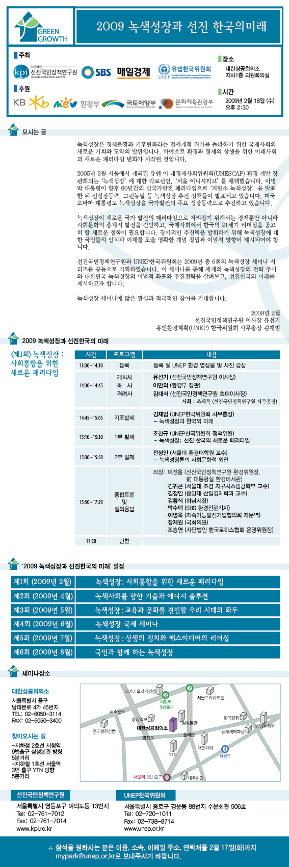 UN 환경 한국위원회와 선진국민정책 연구원이 녹색 성장세미나에 여러분을 초대합니다^^ 시간: 2009년 2월 18일(수) 오후 2:30 장소: 대한상공회의소 지하 1층 의원회의실 자세한 내용은 첨부파일에 올렸습니다. 많은 관심 부탁드려요~ www.unep.or.kr