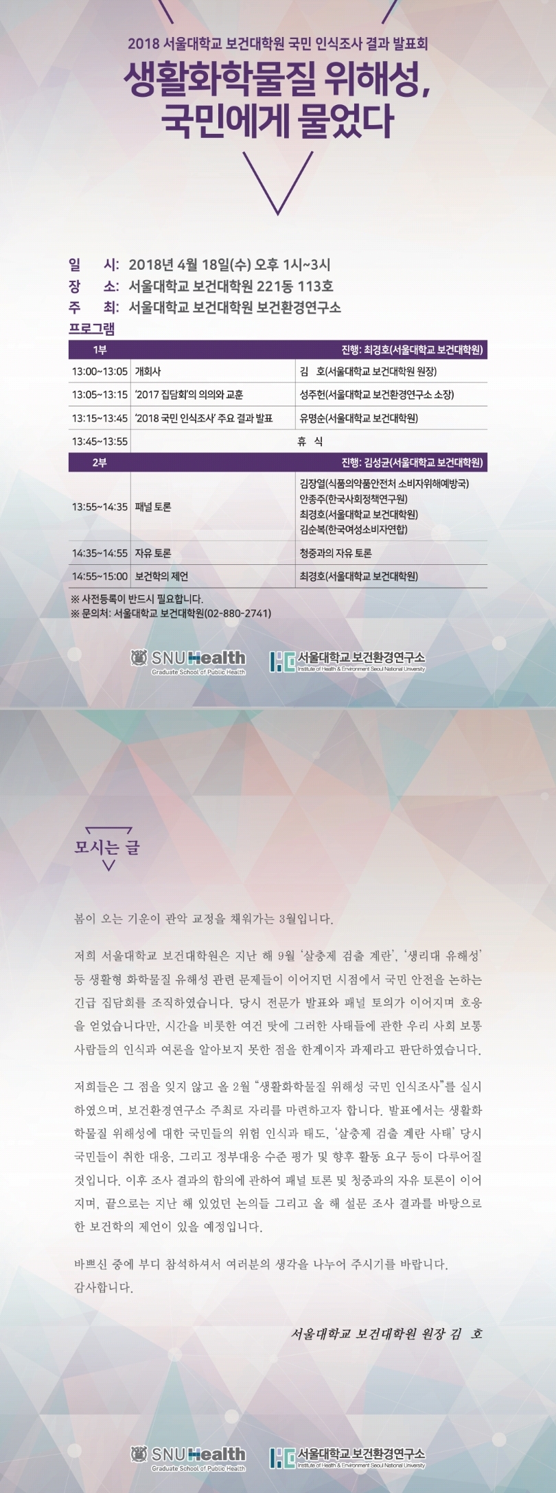 | <생활화학물질에 대한 국민인식도 조사 결과 발표회> 서울대학교 보건대학원에서 '생활화학물질에 대한 국민인식도 조사 결과'를 발표합니다. 가습기살균제 참사, 살충제 계란파동과 생리대 유해물질 논란을 겪으면서 많은 시행착오를 겪었고 여러 연구와 법제도의 정비도 진행되지만 우리 국민들이 인식하는 위험체감도와 거리가 있다고 생각합니다. 그 차이가 어느 정도이며 어느 지점인지 국민패널에 묻고 보건대학원에서 분석한 결과를 4/18(수) 1시, 서울대학교 221동(보건대학원)에서발표합니다. 많은 관심과 참여 부탁드립니다. 참가 신청은 아래 링크로 부탁드립니다. https://goo.gl/forms/fA9cR1PZDvkLfpjo2 |