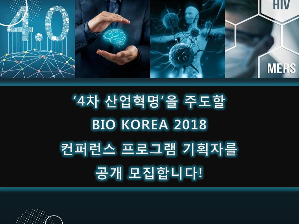 [BIO KOREA 2018] 컨퍼런스 프로그램 공개 모집! (9/27 마감) BIO KOREA는 대한민국 대표 보건산업 국제컨벤션으로서 지난 12년 간 국내외 바이오 헬스산업 전반을 아우르며 보건산업 발전을 선도해 왔습니다. 특히, 컨퍼런스에서는 매년 보건산업 분야의 세계적인 석학, 전문가들의 최신 산업 기술 동향 교류 및 토론의 장을 제공하고 있으며 기술 라이센스, 줄기세포, 치료용 항체, 디지털헬스케어, 창업, 정밀의학, 투자, IP 관리 등 바이오 연구분야 및 산업 관련 최신 정보를 활발히 다루고 있습니다. 다가오는 BIO KOREA 2018 컨퍼런스에서는 정밀의료, 빅데이터, 디지털헬스케어,뇌과학, 감염질환, 종양학, 면역치료, 항체 등 '4차 산업혁명' 이라는 대주제로 프로그램을 구성하고자 하오니 컨퍼런스 세션 프로그램 기획에 관심 있으신 분들의 많은 참여바랍니다. 자세한 안내는 첨부파일의 가이드라인을 참조해주시기 바라며, 신청서 작성 후 담당자(황지희, 02-958-2869, biokoreaconference@gmail.com)에게 회신 및 연락 주시기 바랍니다. 감사합니다. |