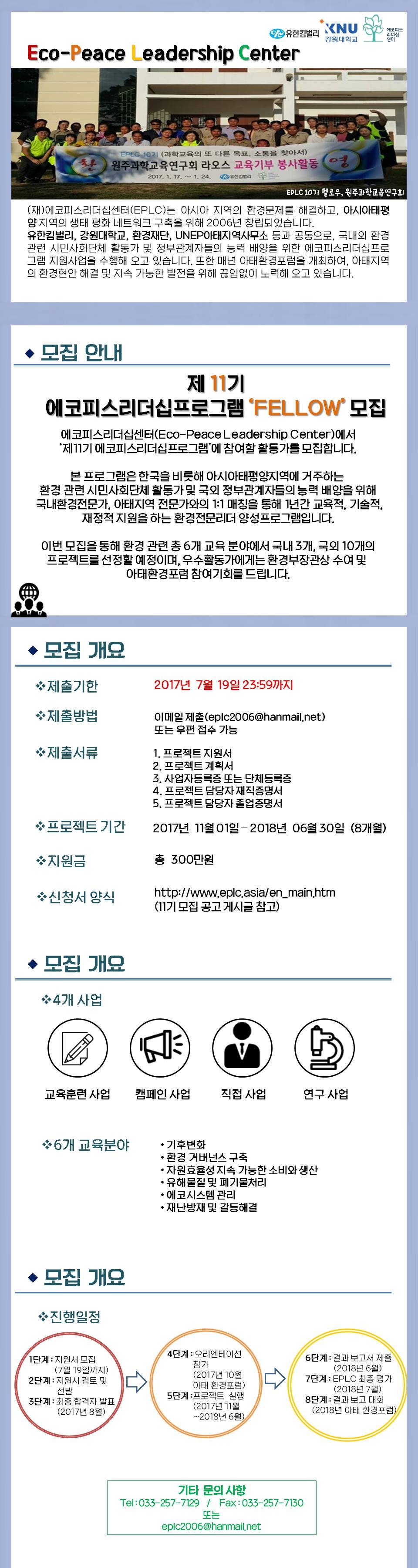 아시아지역의 환경문제 해결 및 아시아태평양 지역의 생태 평화 네트워크의 구축을 위해 설립된 (재)에코피스리더십센터(EPLC)에서 2017년 ‘제11기 에코피스리더십프로그램 지원사업’을 공고하고자 합니다.2006년 설립된 에코피스리더십센터는 지난 10년간 아시아태평양 지역의 환경현안 해결을 통한 지속가능한 발전을 위해 끊임없이 노력해 왔습니다.