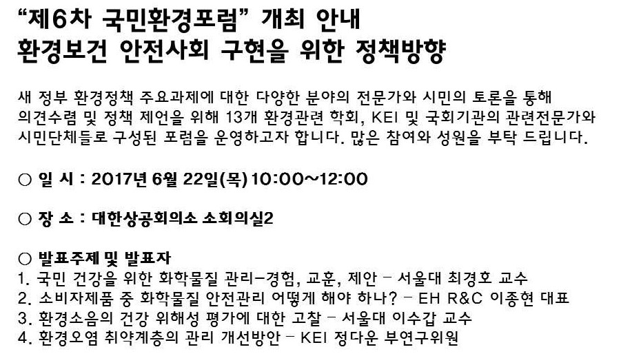 | ○ 논의사항(안) : 환경보건 분야의 여건 및 주요 이슈를 점검하고 환경보건 안전사회 구현을 위한 정책방향에 대해 논의 1. 화학물질 및 화학제품 관리 현황 및 개선 방안 2. 소음 등 생활환경 유해인자로 인한 건강 영향 및 관리 방안 3. 취약.민감계층 건강 보호를 위한 정책 방안 |