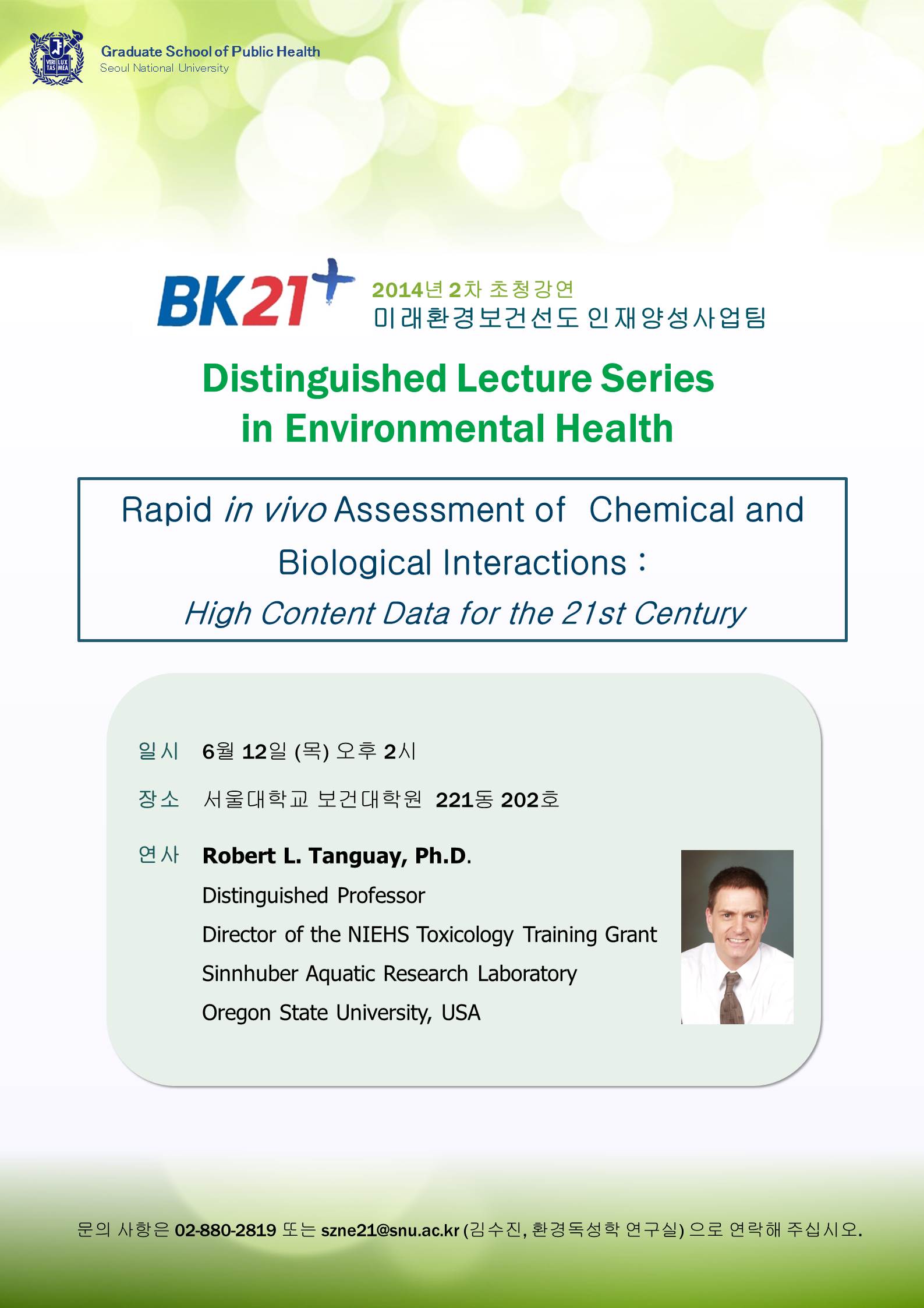 6월 12일 목요일 오후 2시부터 BK 세미나 2차 초청강연이 있습니다. 제브라피쉬를 이용한 독성학 분야에서 꽤나 유명한 연구자로서 연사는 오레곤 주립대학교 Robert L. Tanguay 교수입니다. 회원 여러분의 많은 관심부탁드립니다. 문의 사항은 02-880-2819 또는 szne21@snu.ac.kr (김수진, 환경독성학 연구실) 으로 연락해 주십시오. |